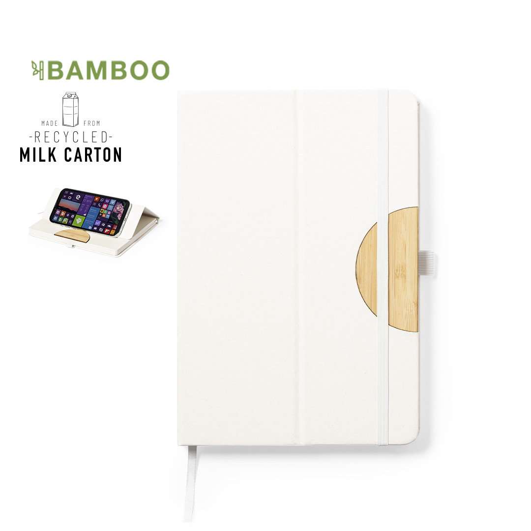 Taccuino della linea natura trasformabile in supporto per smartphone e realizzato con cartoni del latte riciclato. Copertine rigide, con dettaglio in bambù sulla copertina e chiusura elastica in tinta, comprensivo di portapenne. Interno con 80 fogli a riga singola e etichetta cartone del latte riciclato sul retro copertinaInclude penna realizzata con cartoni del latte riciclati e dettagli bianchi con meccanismo a pulsante e inchiostro blu. Con etichetta cartone del latte riciclato sulla parte superiore della penna.I cartoni del latte sono realizzati principalmente in cartone e alluminio. Durante il suo processo di riciclo, i diversi materiali di imballaggio vengono separati per il riutilizzo e il nuovo utilizzo, contribuendo così a percorrere il sentiero infinito dell'economia circolare. Questo materiale si caratterizza per il suo alto grado di riciclabilità, oltre che per la sua leggerezza e resistenza.