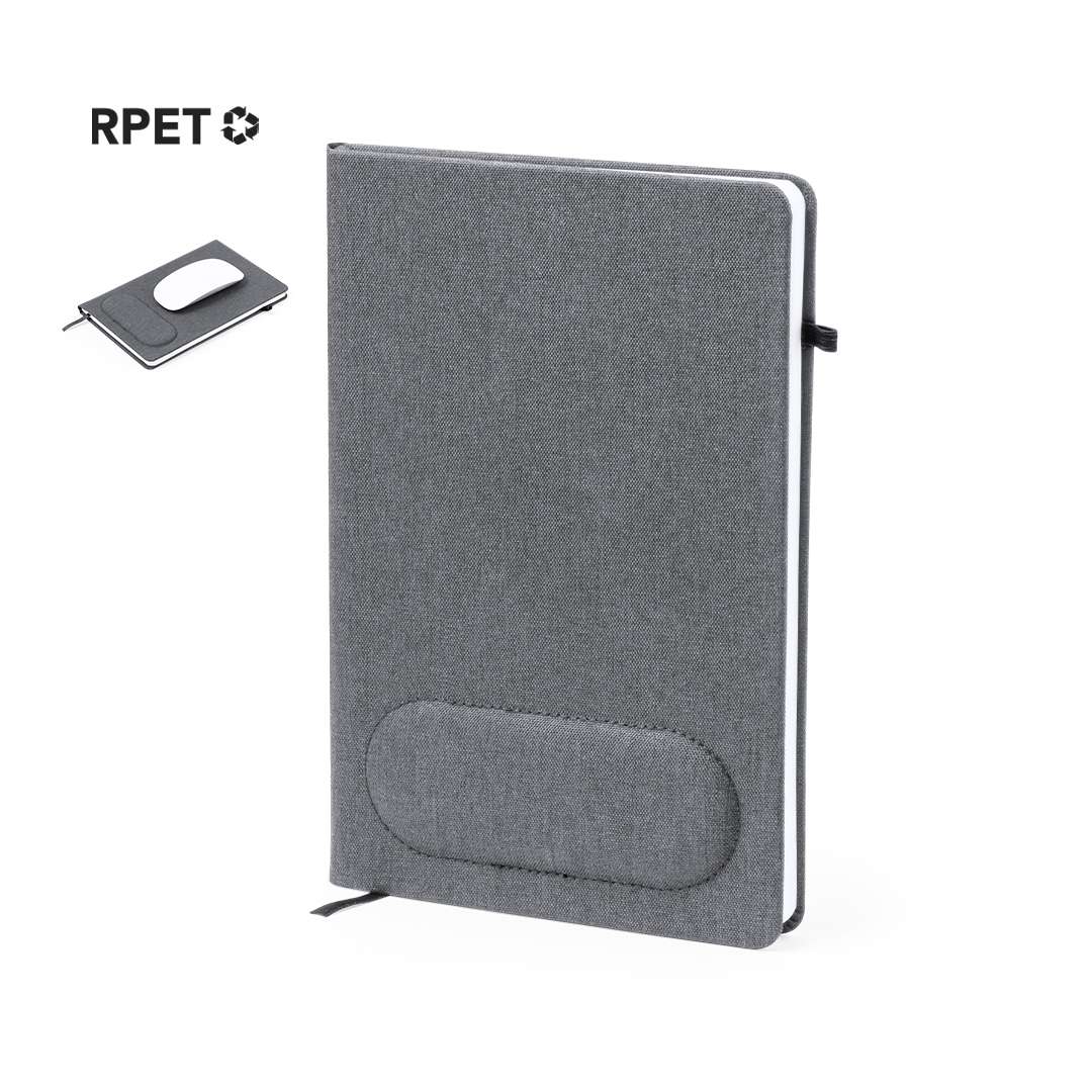 Taccuino per appunti realizzato in RPET 300D con copertina rigida. Si distingue per l'originale supporto della copertina con forma ergonomica per il polso da utilizzare come tappetino per il mouse. Include un segnalibro e un portapenne coordinato. Contiene 100 pagine interne lisce ed è disponibile in un elegante colore grigio. Con logo RPET sul retro della copertina e presentato in una busta individuale riciclata.Il materiale RPET è realizzato con plastica riciclata per incoraggiare il riutilizzo dei rifiuti plastici e contribuire alla sostenibilità del pianeta.