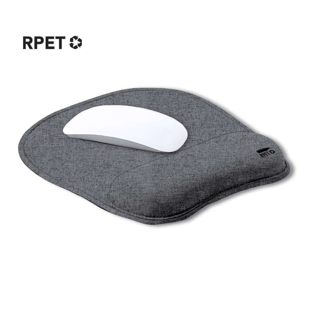 Tappetino mouse in morbido poliestere RPET, realizzato con plastica riciclata per incoraggiare il riutilizzo dei rifiuti di plastica e aiutare la sostenibilità del pianeta. Con base in silicone antiscivolo e poggiapolsi imbottito per prevenire stress e dolori articolari. Etichetta RPET stampata.
