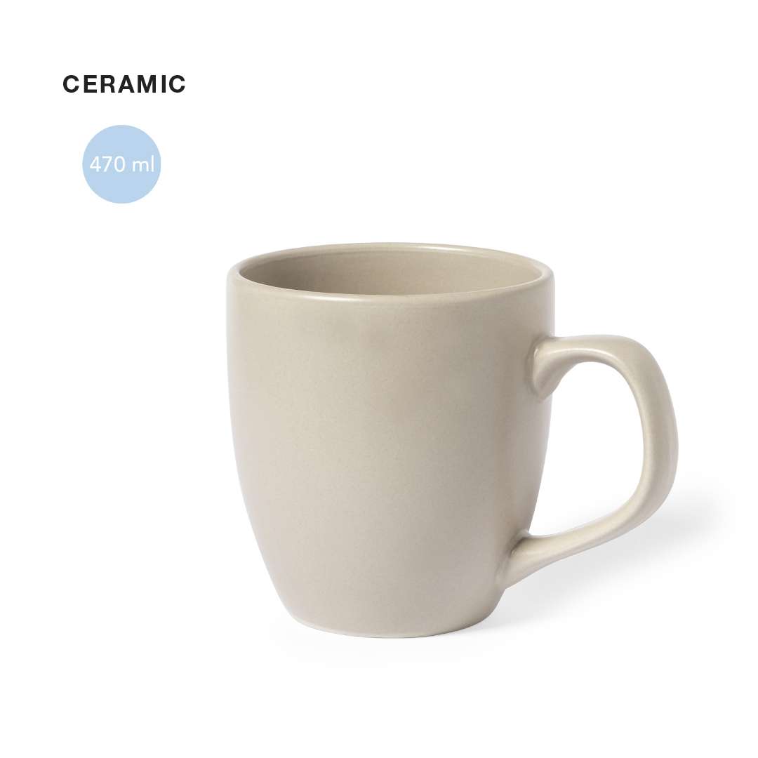 Tazza in ceramica con capacità di 470 ml. Finitura opaca e colore naturale. Presentata in una scatola individuale.