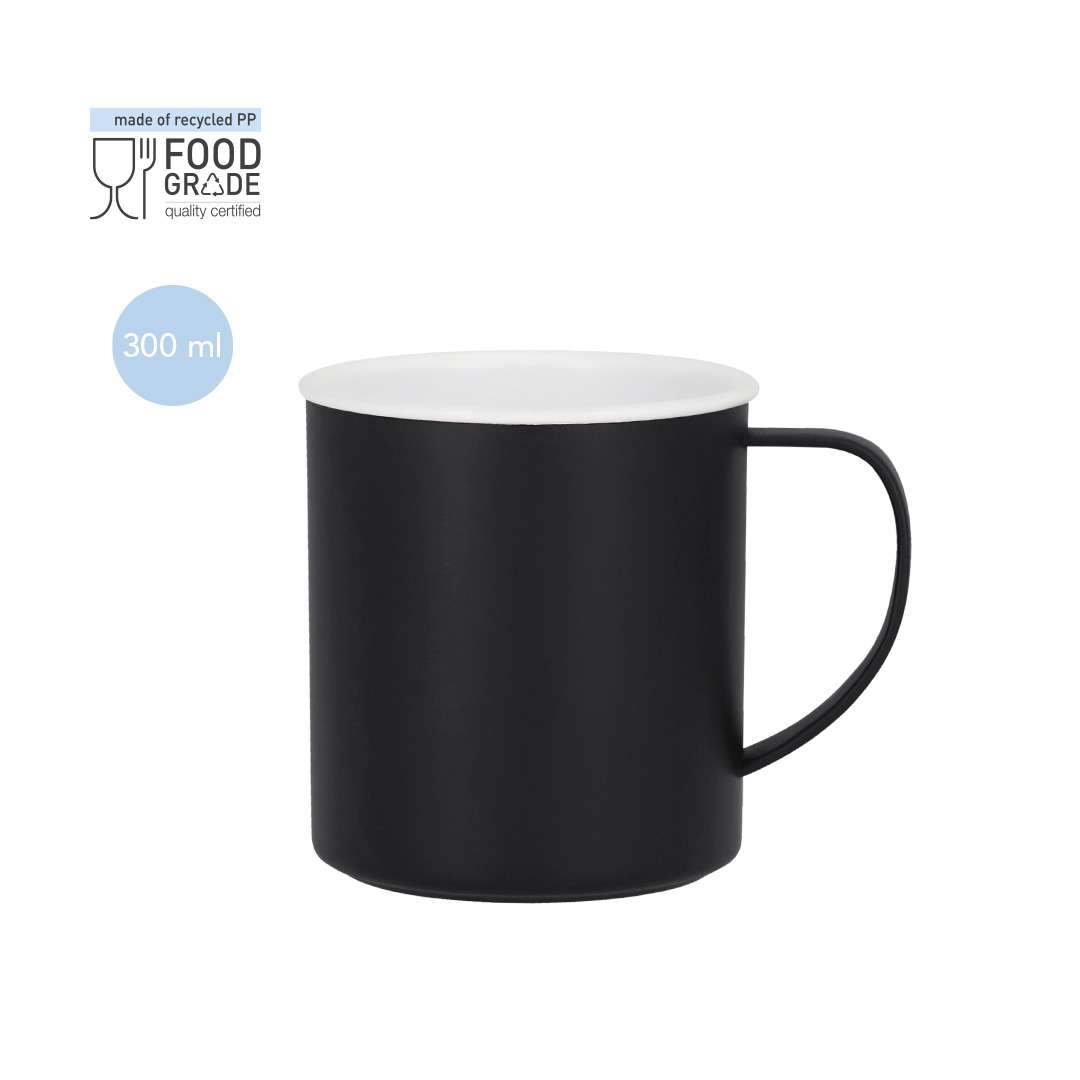 Tazza in PP riciclato con una capacità di 300 ml. Presenta un interno bianco e un esterno in colori distintivi. Senza BPA.Il PP riciclato è una plastica riciclata e altamente riciclabile, molto resistente e adatta a una moltitudine di applicazioni.Certificato per uso alimentare, garantendo la sicurezza quando il cibo viene a contatto con il materiale utilizzato per fabbricare il prodotto.
