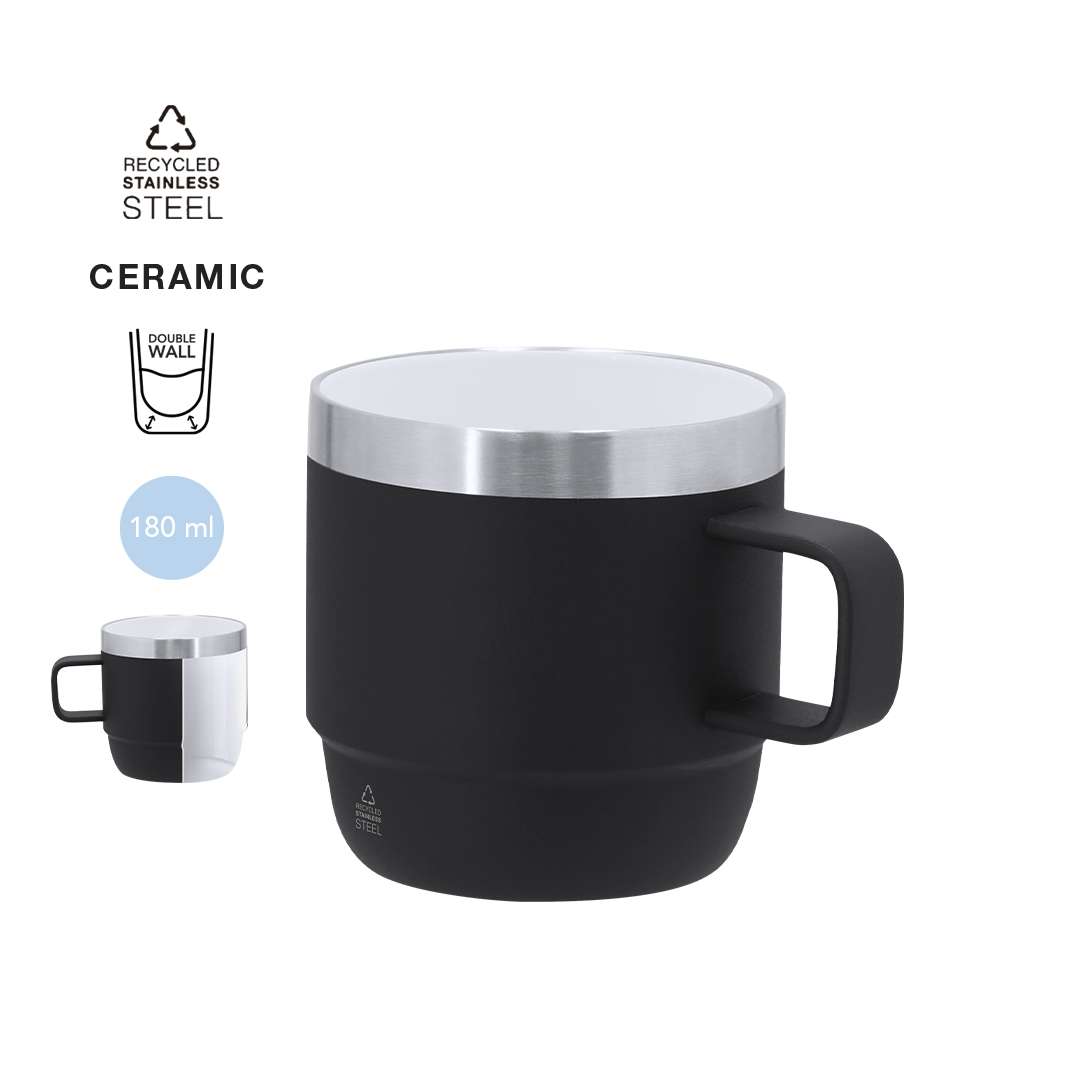 Tazza realizzata in Acciaio Inox Riciclato a doppia parete e capacità di 180ml. Con doppia parete per una migliore e più duratura conservazione della temperatura e interno con rivestimento in ceramica, adatta per bevande gassate. Con distintivo di Acciaio Inox Riciclato.L'acciaio è uno dei materiali più richiesti e può essere trovato quasi ovunque, da prodotti di uso quotidiano a grandi costruzioni. Con innumerevoli proprietà, tra cui la durabilità e il suo alto grado di riutilizzo, rendendolo un'alternativa molto valorizzata nelle soluzioni di sostenibilità. Adeguatamente trattato, consente di ottenere nuove risorse di utilizzo infinito.