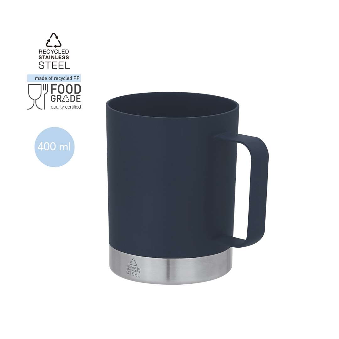 Tazza in PP riciclato, combinata con base in acciaio inossidabile riciclato. Con 400 ml di capacità.Con certificazione Food Grade, garantendo la sicurezza quando gli alimenti entrano in contatto con il materiale usato per fabbricare il prodotto. Con etichetta di Acciaio Inox Riciclato.Il PP riciclato è una plastica riciclata e altamente riciclabile, di grande resistenza e adatta per molteplici applicazioni.L'acciaio è uno dei materiali più richiesti e che può essere trovato quasi ovunque, da prodotti di uso quotidiano a grandi costruzioni. Con innumerevoli proprietà, tra cui spiccano durabilità e alto grado di riutilizzo, rendendolo un'alternativa molto apprezzata nelle soluzioni di sostenibilità. Adeguatamente trattato, permette di ottenere nuove risorse di utilizzo infinito.