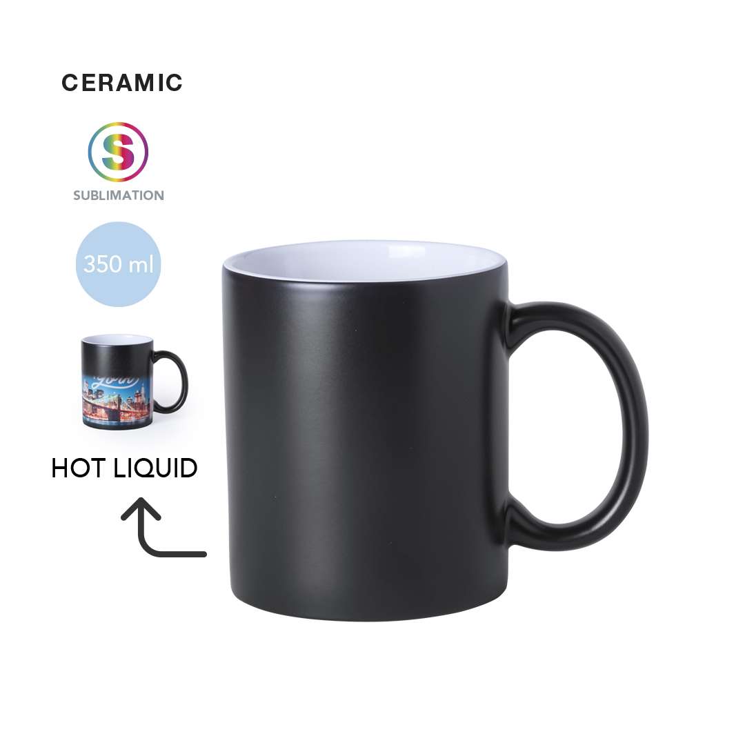 Tazza in ceramica della capacità di 350 ml con esterno nero e interno bianco. Appositamente progettata per la stampa in sublimazione. Confezionata in una scatola individuale.Manuale di istruzioni disponibile in spagnolo e inglese.