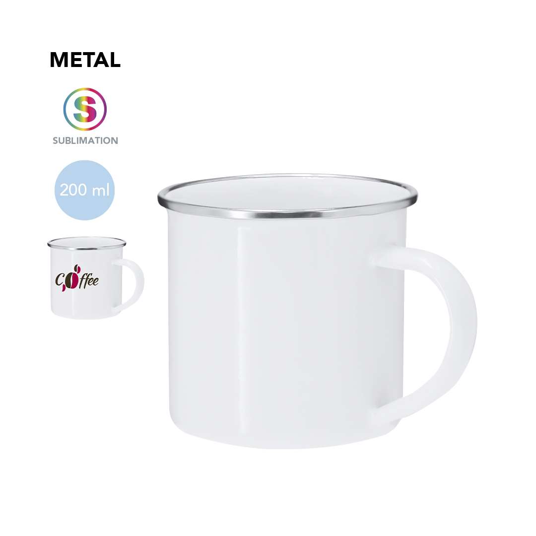 Tazza metallica da 200 ml di capacità con design vintage e finitura bianco brillante con elegante dettaglio cromato sul bordo. Progettata specificamente per la sublimazione.