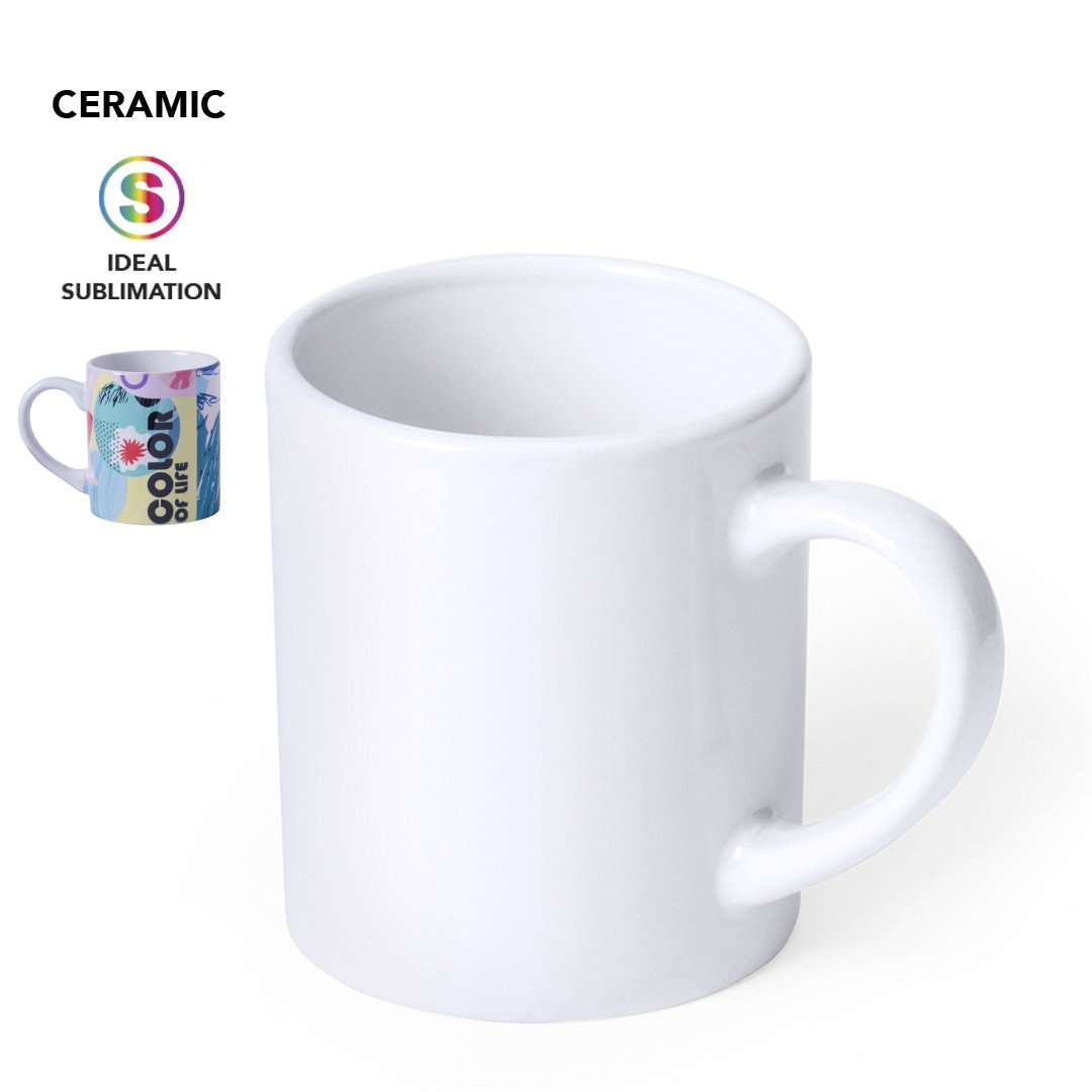 Tazza in ceramica da 250 ml di colore bianco, appositamente progettata per la stampa in sublimazione. Presentata in scatola individuale.