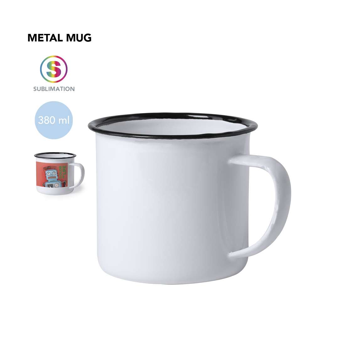 Tazza metallica dal design retrò con capacità di 380 ml. Appositamente progettato per la marcatura a sublimazione, con dettagli eleganti in nero e presentato in una scatola individuale. Finitura irregolare per evidenziare il look vintage della tazza.Manuale di istruzioni disponibile in spagnolo e inglese.