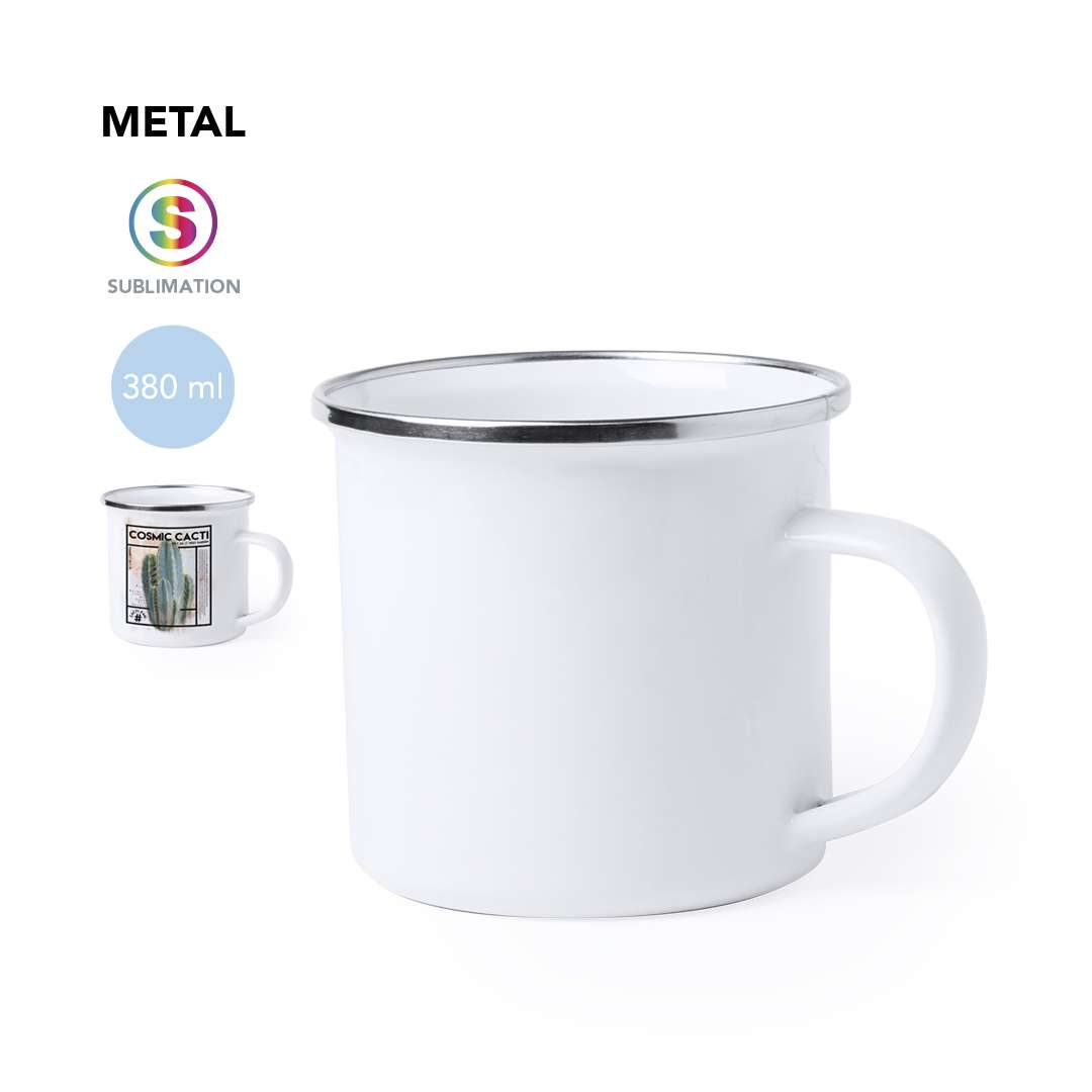 Tazza in metallo dal design retrò e capacità 380ml, con piccole imperfezioni che rafforzano il suo aspetto vintage. Appositamente progettato per la marcatura a sublimazione, con un elegante anello cromato e presentato in una scatola singola