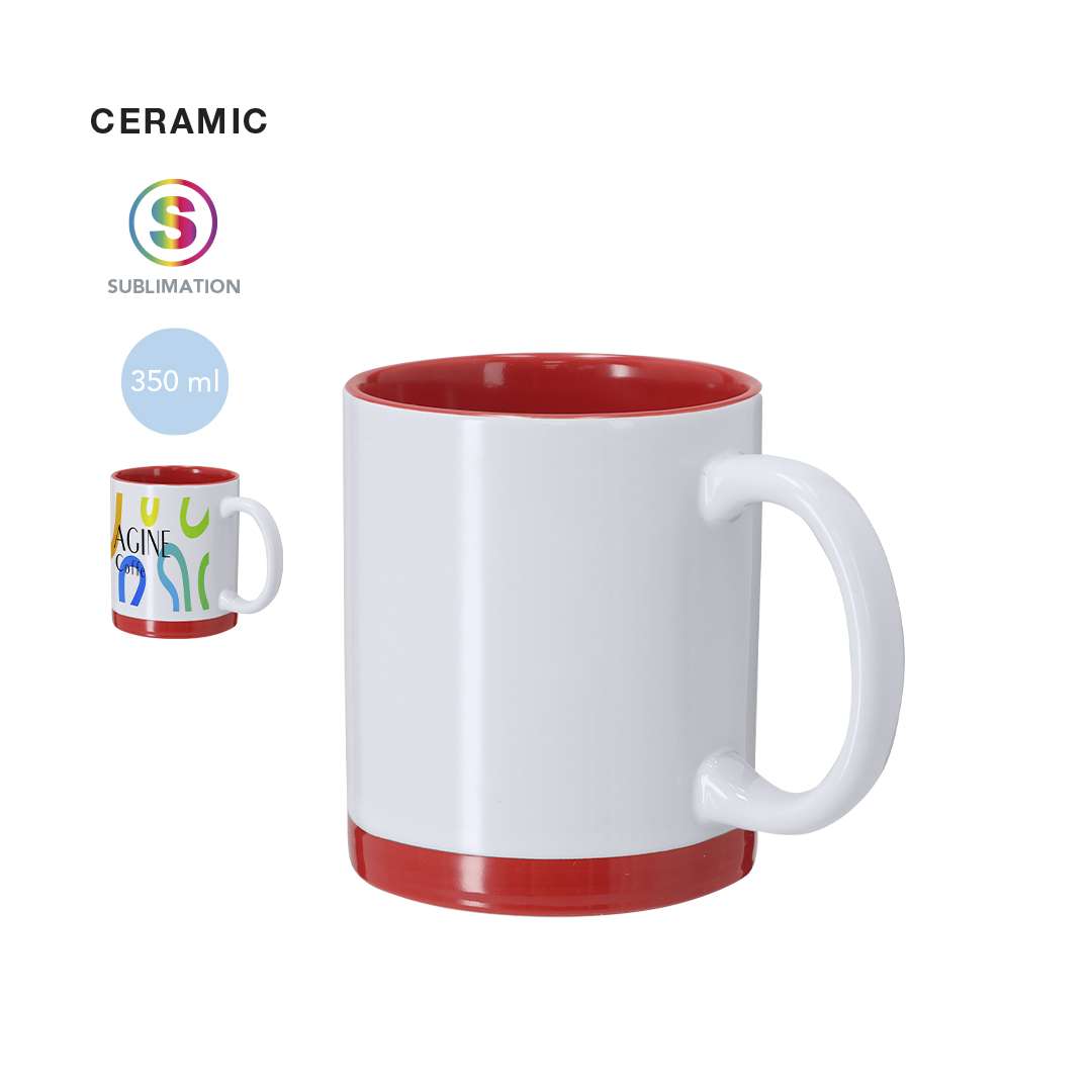 Tazza in ceramica con capacità di 350 ml, progettata con esterno bianco e dettagli colorati abbinati alla base e all'interno. Progettata specificamente per marcatura in sublimazione.