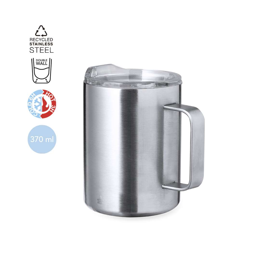 Tazza termica da tavolo in acciaio inox riciclato a doppia parete con capacità di 370 ml. Con dispenser di facile apertura nel coperchio, senza BPA e con finitura argentata. Con logo Recycled Stainless Steel.Confezionata singolarmente in una scatola dal design kraft.L'acciaio è uno dei materiali più richiesti e si trova praticamente ovunque, dai prodotti di uso quotidiano alle grandi costruzioni. Le sue innumerevoli proprietà, tra cui la durata e l'alto grado di riutilizzabilità, lo rendono un'alternativa molto apprezzata nelle soluzioni di sostenibilità. Opportunamente trattato, consente di ottenere nuove risorse di uso infinito.