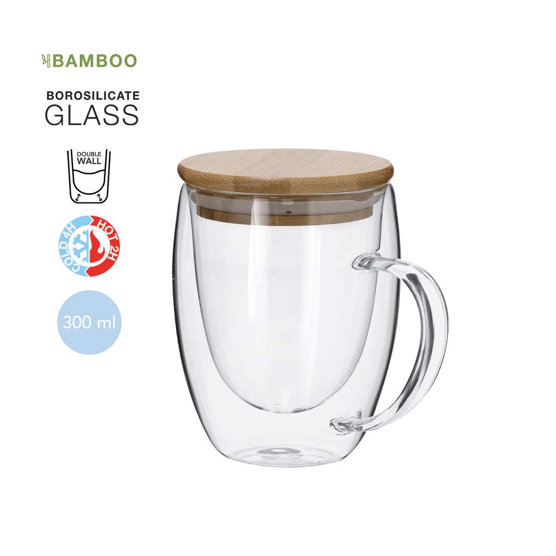 Tazza termica a doppia parete e capacità di 300 ml. Realizzata in vetro borosilicatato con coperchio con sigillo ermetico in bambù.Realizzata in vetro borosilicatato, che offre una resistenza e durabilità eccezionali, allungando la sua vita utile e potendo essere riutilizzata infinite volte.