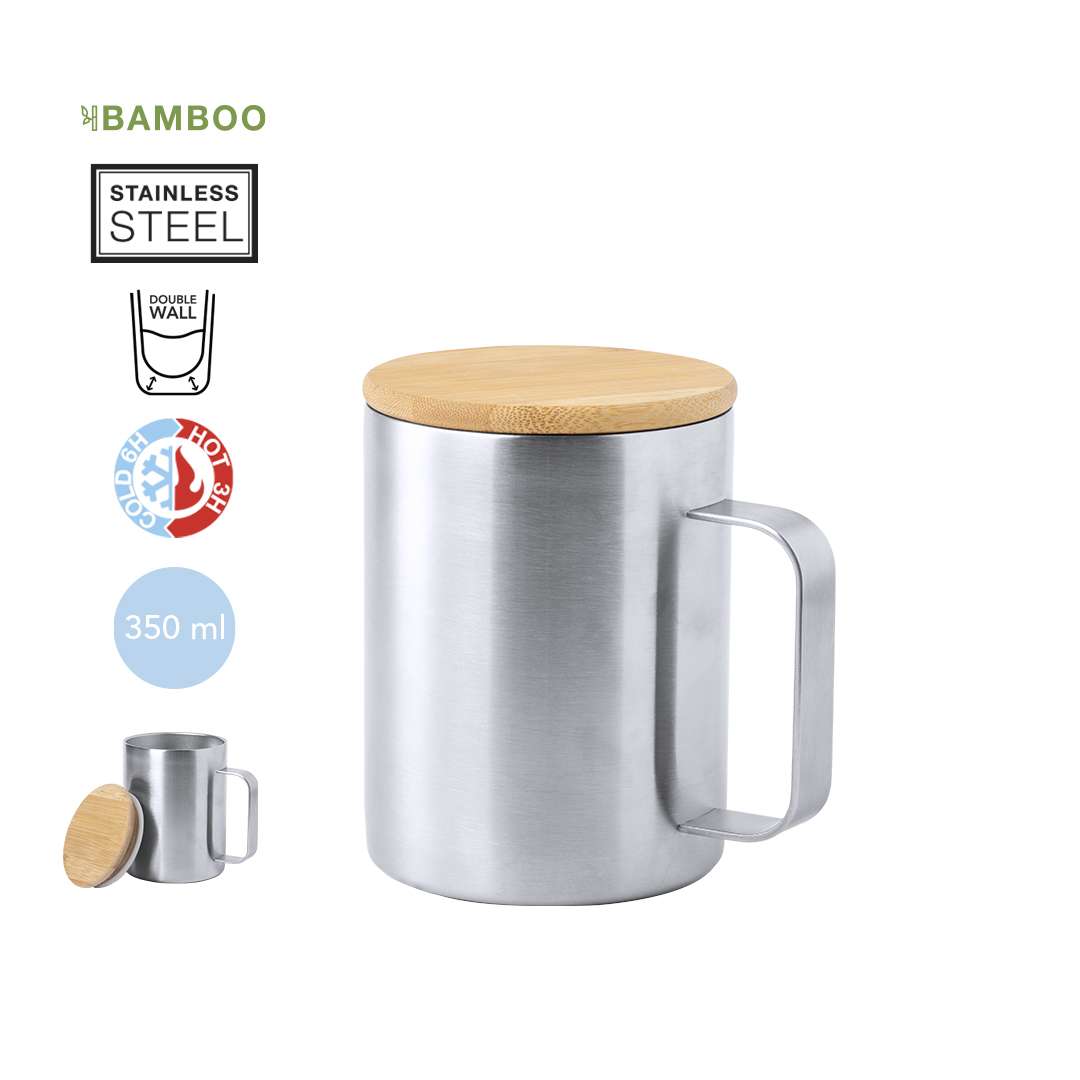 Tazza termica in acciaio inossidabile con una capacità di 350ml. Coperchio in bambù. Confezionato in un'attraente scatola di eco design.