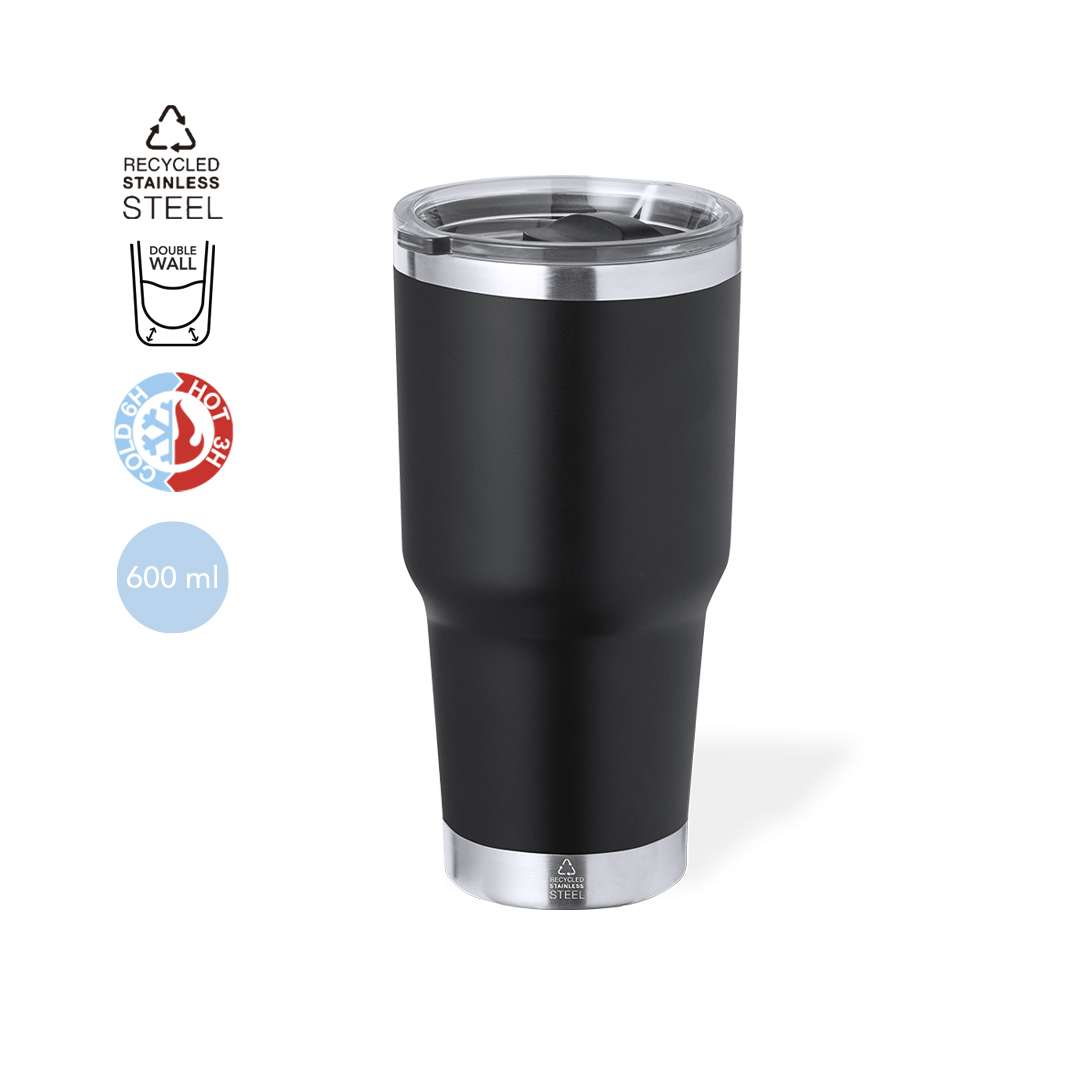 Bicchiere termico da tavolo in acciaio inox riciclato a doppia parete con capacità di 600 ml. Con coperchio dosatore e apertura facilitata, senza BPA. È ideale per la tua scrivania, tavolo o qualsiasi superficie dove puoi goderti la tua bevanda preferita. Con logo Recycled Stainless Steel. L'acciaio è uno dei materiali più richiesti e si trova praticamente ovunque, dai prodotti di uso quotidiano alle grandi costruzioni. Le sue innumerevoli proprietà, tra cui la durata e l'alto grado di riutilizzabilità, lo rendono un'alternativa molto apprezzata nelle soluzioni di sostenibilità. Opportunamente trattato, consente di ottenere nuove risorse di uso infinito.