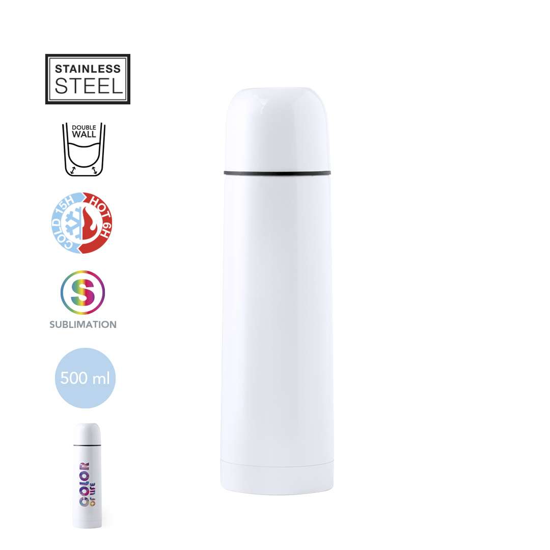 Thermos da 500 ml in robusto acciaio inox. Superficie esterna appositamente studiata per la stampa in sublimazione. Con tappo di sicurezza e presentato singolarmente in un attraente scatola di design.