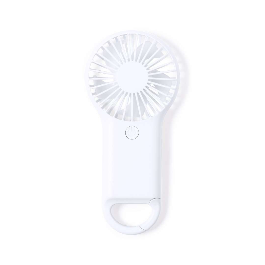 Ventilatore in robusto ABS bianco con gancio a moschettone integrato. Con 2 velocità di funzionamento e presentato singolarmente in scatola dal desing kraft. Alimentazione a batteria (3xAAA non inclusa).