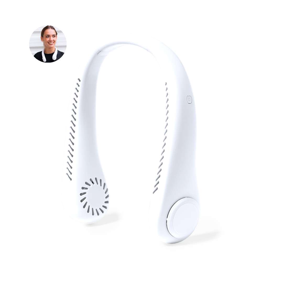 Pratico ventilatore portatile realizzato in resistente ABS. Questo elegante ventilatore ha un design a forma di collana da posizionare intorno al collo, fornendo una sensazione di freschezza. Offre tre diverse impostazioni di velocità ed è ricaricabile tramite la batteria da 800 mAh, cavo Micro USB incluso. Presentato in una scatola dal design kraft.