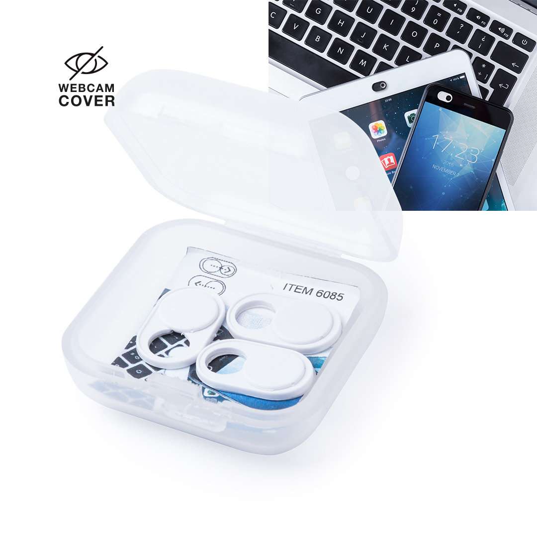Copertura per fotocamera di dispositivo mobile per proteggere la privacy. In formato ultra compatto e servita in astuccio individuale semitrasparente con 3 pezzi. Disponibile nei colori bianco e nero, set presentato in polybag con cartoncino di design.