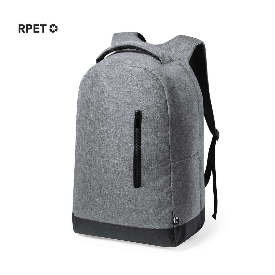 Zaino aziendale antifurto della linea Nature in resistente RPET 600D effetto melange, realizzato in plastica riciclata per favorire il riutilizzo dei rifiuti plastici e contribuire alla sostenibilità del pianeta. Include una tasca antifurto per riporre oggetti di valore. Tasca esterna con chiusura a cerniera con due scomparti interni imbottiti per computer portatili fino a 15 pollici e tablet fino a 12 pollici Spallacci e schienali con imbottitura ergonomica e etichetta con logo RPET.
