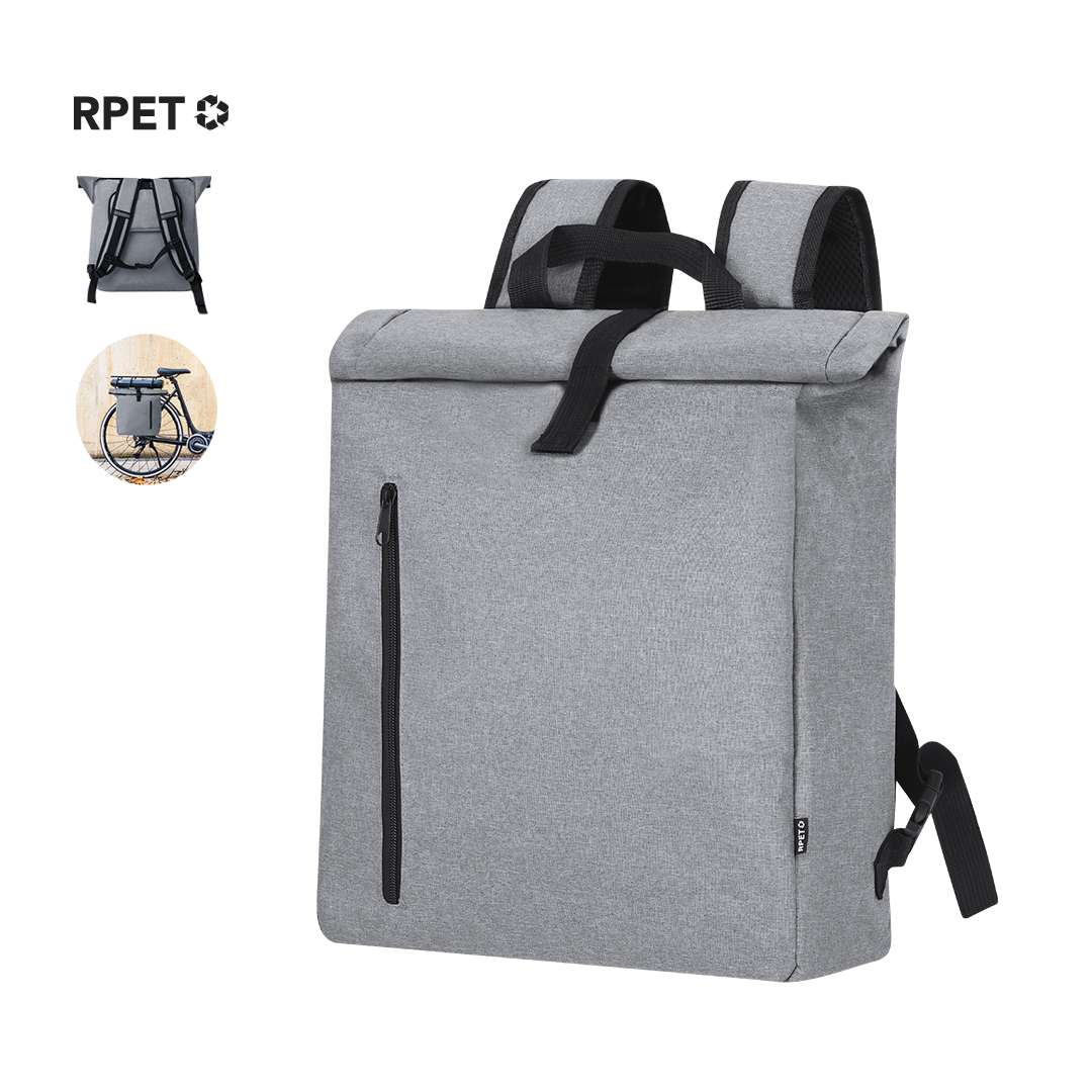 Zaino da bicicletta realizzato in resistente 600D RPET. Versatile e con chiusura a fibbia, include una pratica tasca frontale con zip. Sul retro è dotato di specifici attacchi universali per biciclette, che garantiscono maggiore comfort e sicurezza durante gli spostamenti. Dispone inoltre di spallacci imbottiti e regolabili per un trasporto più confortevole quando si stacca dalla bicicletta. Etichetta esterna con logo RPET.Il materiale RPET è realizzato con plastica riciclata per incoraggiare il riutilizzo dei rifiuti plastici e contribuire alla sostenibilità del pianeta.