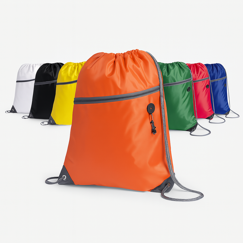 Sacca in morbido poliestere 210D. Con tasca frontale con zip e uscita per le cuffie. Corde autostringenti di colore grigio, cerniera in tinta e angoli con anelli metallici e rinforzo in similpelle. Disponibile in un'ampia gamma di colori.
