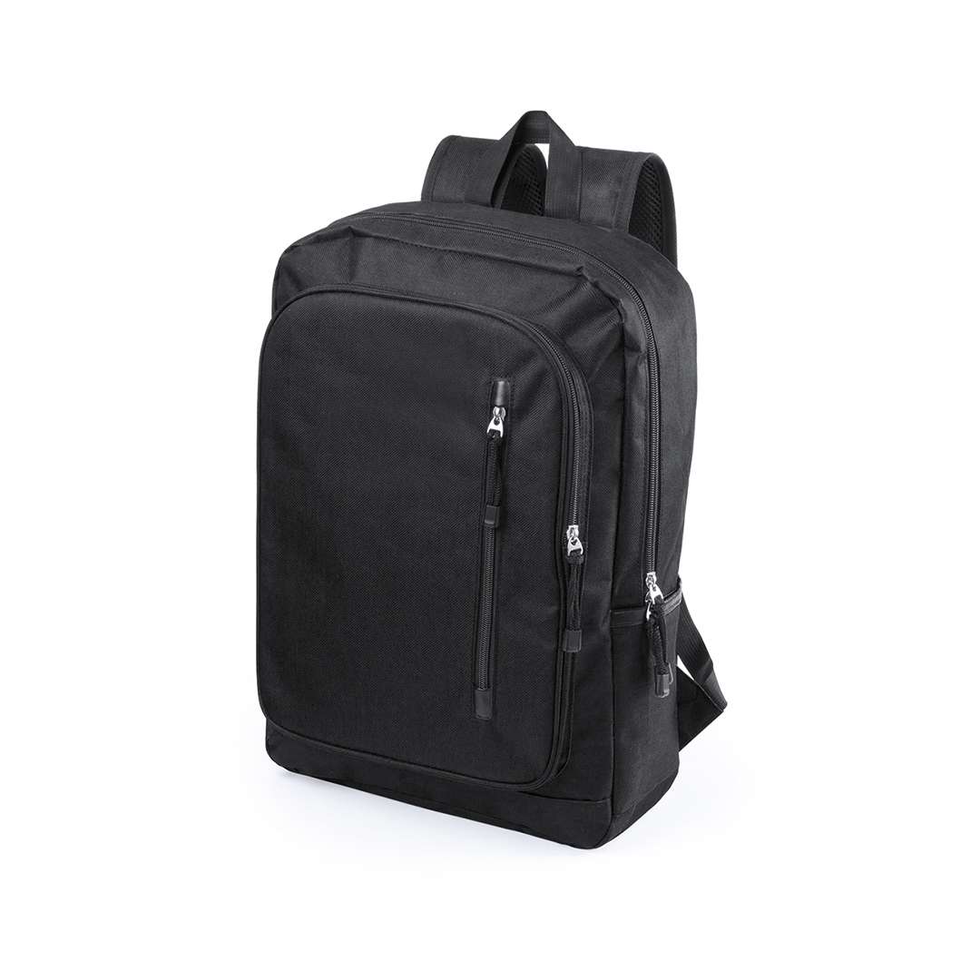 Zaino in resistente poliestere 600D con chiusura a zip e tasche anteriori. In colori sobri, con schienale e spallacci imbottiti, scomparto interno imbottito per laptop fino a 15" e cinghie sui manici per una facile apertura.