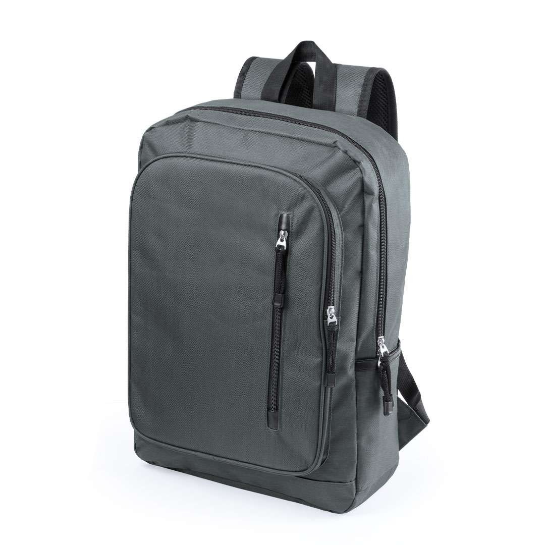 Zaino in resistente poliestere 600D con chiusura a zip e tasche anteriori. In colori sobri, con schienale e spallacci imbottiti, scomparto interno imbottito per laptop fino a 15" e cinghie sui manici per una facile apertura.
