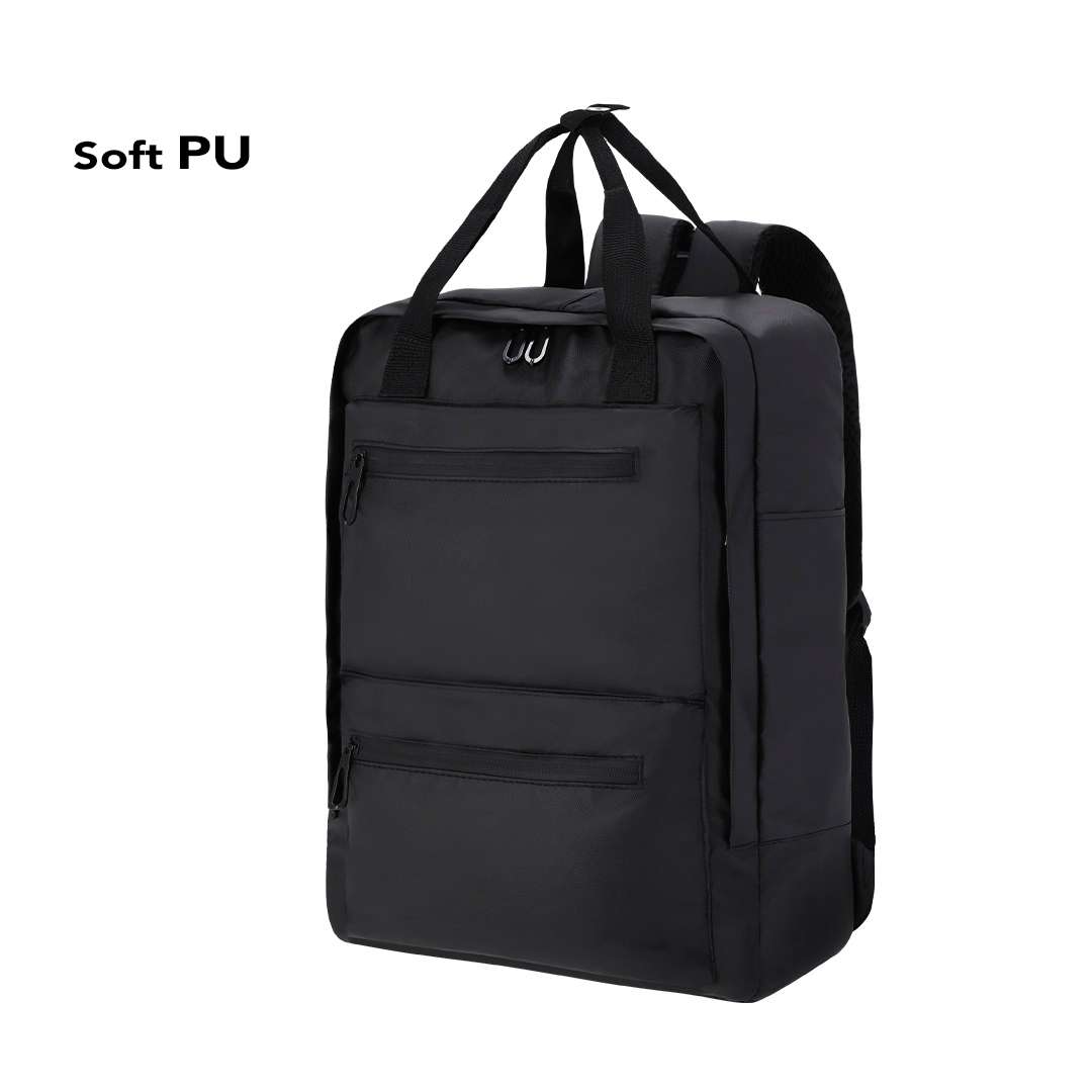 Zaino in PU resistente. Dotato di un compartimento principale e due tasche frontali per un rapido accesso. Chiusure con cerniera invisibili. Include due tasche laterali e maniglie doppie per il trasporto, rinforzate nella parte superiore con una cinghia di collegamento per un facile trasporto. Dotato di una tasca interna imbottita per laptop fino a 15 pollici e una tasca per tablet fino a 10 pollici. Spallacci e schienale imbottiti, traspiranti e regolabili.