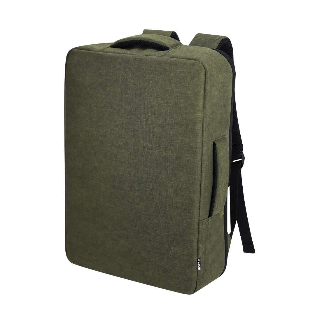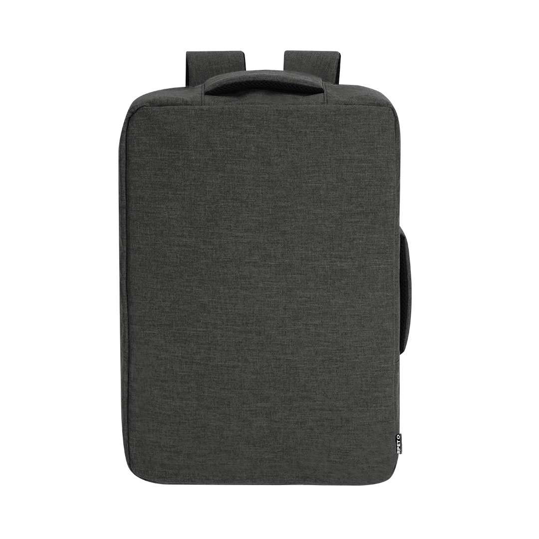 Zaino portadocumenti realizzato in resistente RPET 300D. Presenta un design urbano che incorpora una tasca principale con chiusura a zip nascosta per maggiore protezione, con doppio tiratore. Con interno imbottito per laptop fino a 15 pollici, tasche aggiuntive all'interno per piccoli oggetti. Le cinghie delle spalle e la schiena sono imbottite e regolabili per maggiore comfort. Offre tre modalità di trasporto: come zaino, grazie alle cinghie delle spalle imbottite; come portadocumenti, grazie alla maniglia di trasporto; e cinghia per trolley.Il materiale RPET è realizzato a partire da plastica riciclata, per promuovere il riutilizzo dei rifiuti plastici e contribuire alla sostenibilità del pianeta.