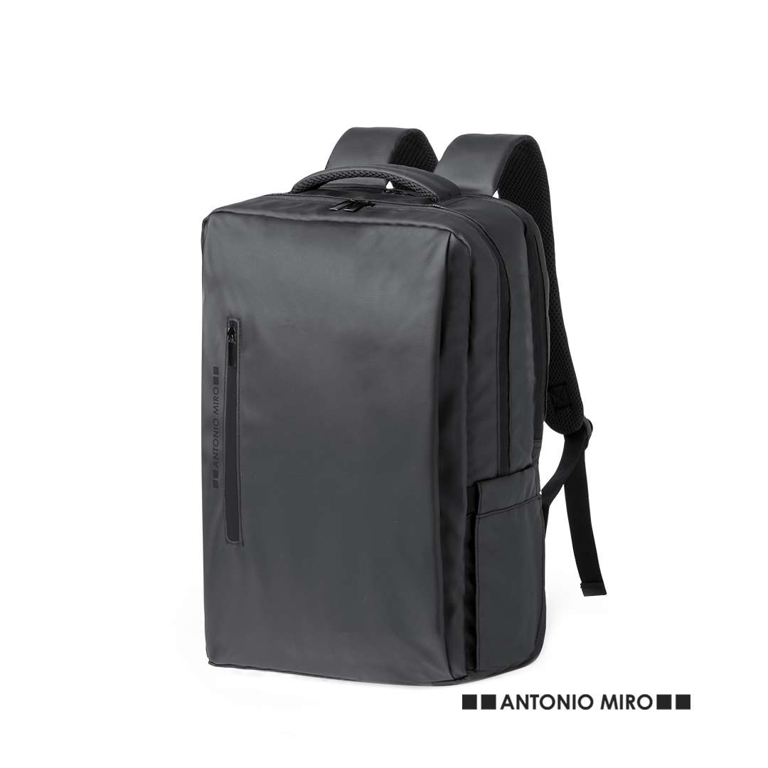 Zaino by Antonio Miró di qualità premium in resistente similpelle dal design sobrio in nero. Con doppia chiusura con cerniera, tasca frontale e manico imbottito rinforzato. Dotato di imbottitura ergonomica su schienale e spallacci, comprende uno scomparto interno imbottito per laptop fino a 15 pollici e tablet fino a 10 pollici. Inoltre, dispone di una tasca antifurto con chiusura a cerniera sul retro. Spazi interni per penne e smartphone. Con logo del marchio sul davanti.