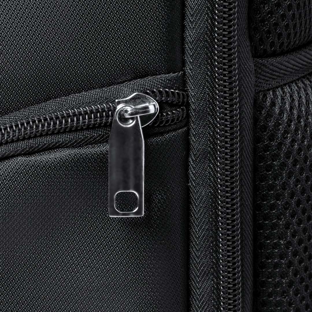 Zaino di alta qualità realizzato in resistente Nyon 600D con finitura nera. Scomparto principale con chiusura a zip in tinta e doppio tiretto. Include 3 tasche esterne e 2 tasche laterali, tutte con chiusura a zip. Maniglia, schienale e spallacci imbottiti, che sono anche regolabili. Interno con scomparti imbottiti per laptop fino a 17" e tablet fino a 12". Supporto posteriore per la sistemazione su trolley.