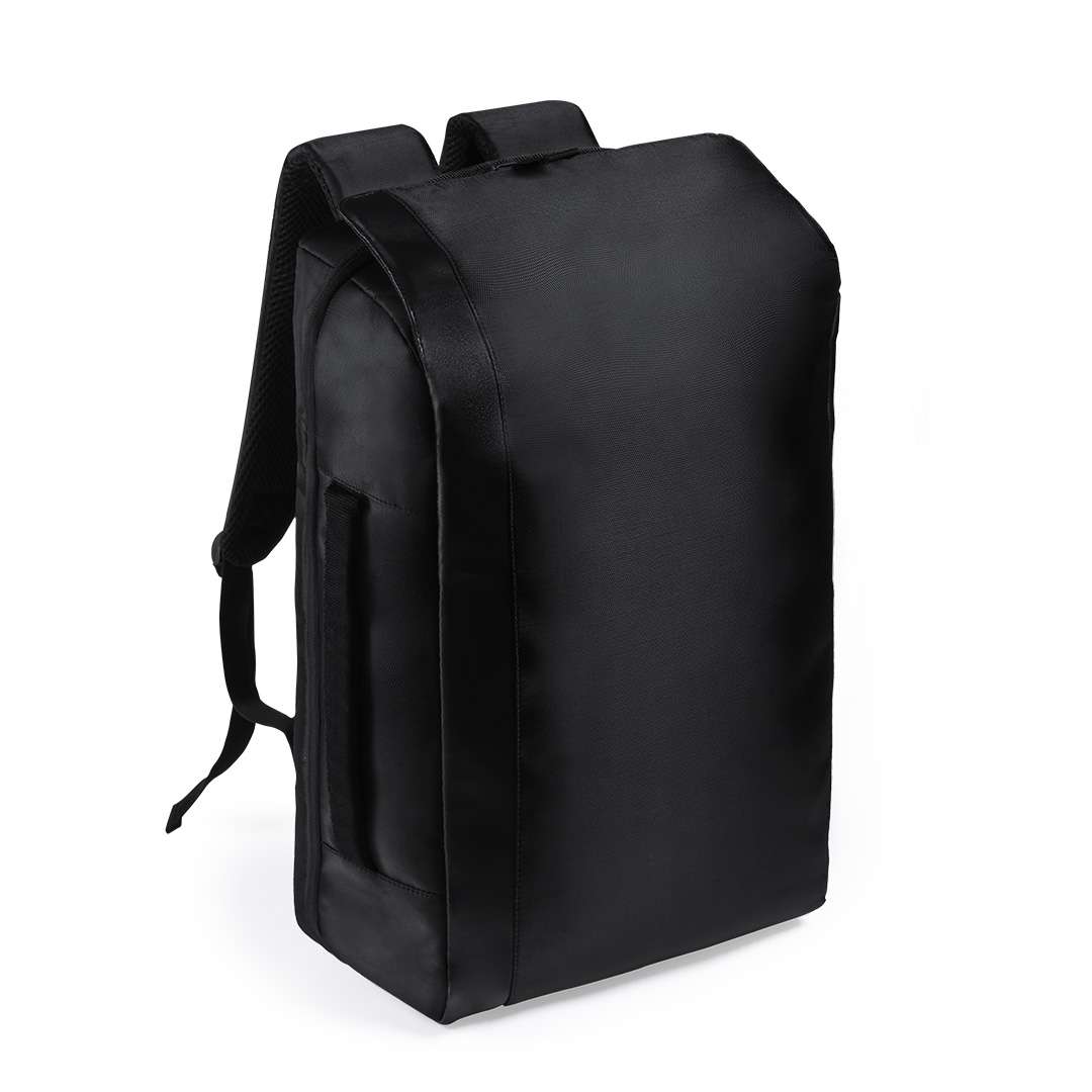 Zaino elegante in poliestere resistente con dettagli in similpelle. Con ampia patta frontale e scomparto principale con chiusura a zip a doppio cursore. Interno con tasche imbottite per tablet fino a 12 e laptop fino a 17. Maniglia laterale imbottita e accessorio per aggancio al trolley, con tasca antifurto sul retro. Schienale e spallacci regolabili e imbottiti.