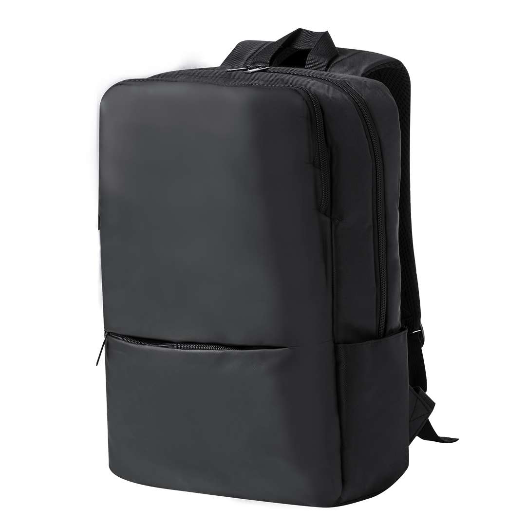 Elegante zaino in ecopelle dal design urbano, dotato di una tasca principale imbottita con doppia chiusura a zip per tablet fino a 10" e laptop fino a 15", oltre a una tasca secondaria e una tasca frontale con zip. Lo schienale e gli spallacci sono imbottiti, regolabili e dotati di tessuto traspirante per dissipare il calore. Include anche un attacco per trolley e una pratica maniglia sulla parte superiore. Confezionato singolarmente in un sacchetto riciclato.