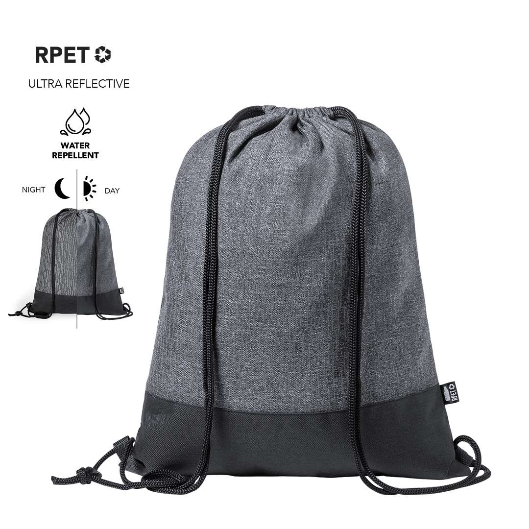 Sacca della linea natura riflettente in resistente poliestere 600D RPET, realizzato in plastica riciclata per incoraggiare il riutilizzo dei rifiuti plastici e aiutare la sostenibilità del pianeta. In un'elegante combinazione di colori nero e grigio, con corde nere autobloccanti. Etichetta RPET distintiva.Realizzata con un tessuto ad elevata capacità riflettente, grazie a milioni di pigmenti riflettenti e basato sul principio della retro-riflessione, una proprietà della visibilità notturna che consiste nella rifrazione della luce verso la fonte della luce stessa