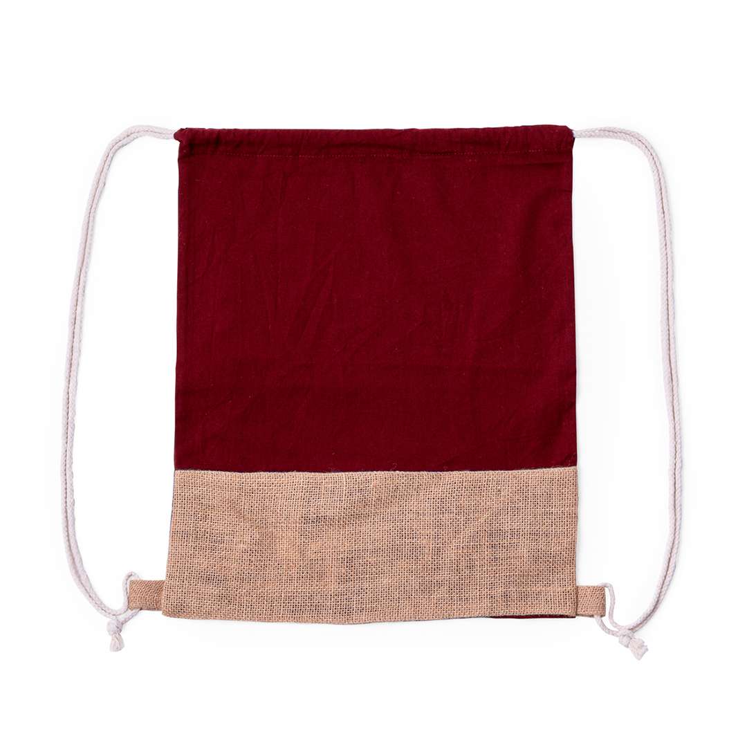 Sacca in materiale cotone 120 g/m2 in combinazione con la juta. Corda di cotone autobloccante di colore bianco con anelli di juta alla base. Disponibile in diversi colori. Resistenza fino a 8 kg di peso.